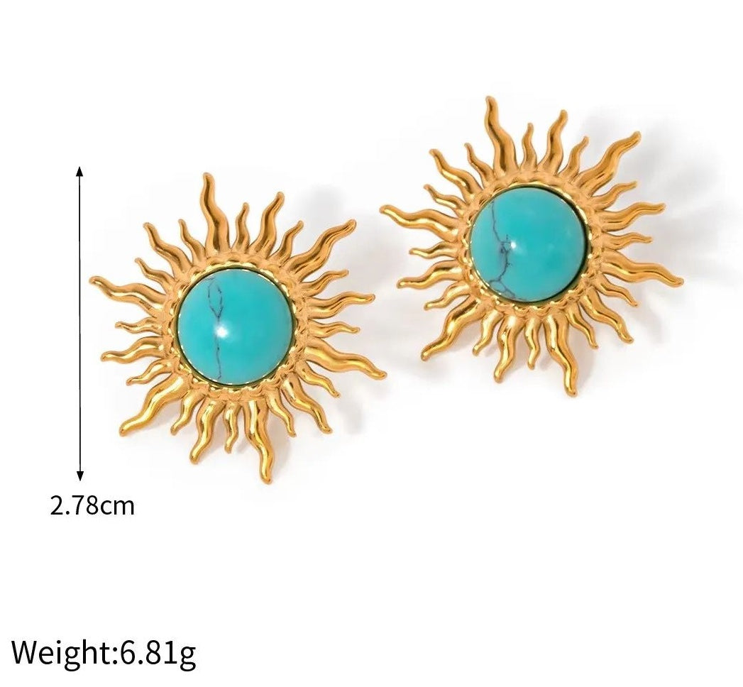 Buy NowThese stunning earrings feature a radiant sunburst design crafted in gold-tone metal, with a vibrant turquoise stone at the center. The intricate sunray details create a bold and striking look, while the turquoise adds a touch of natural elegance. Perfect for making a statement, these earrings are ideal for adding a bohemian or celestial flair to any outfit