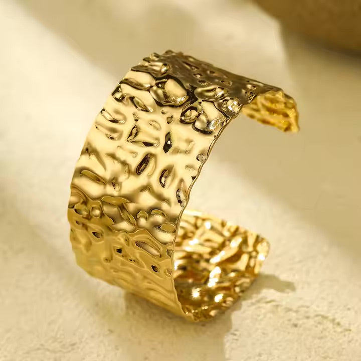 Buy NowBold yet refined, this textured cuff exudes effortless elegance with its sculpted details and organic finish. Inspired by natural elements, its intricate surface catches the light beautifully, adding depth and dimension. Crafted from high-quality, gold-plated 316L stainless steel, it is durable, tarnish-resistant, and designed for lasting wear. A statement piece that embodies strength, sophistication, and timeless style.