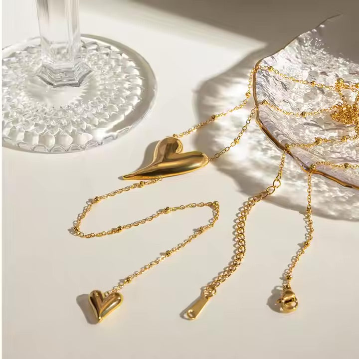 Buy NowA romantic and elegant neckpiece featuring a delicate heart at the center, with a fine chain gracefully cascading down, ending in a dainty second heart. Symbolizing love’s journey and deep connection, this piece adds a touch of allure and sophistication to any look.